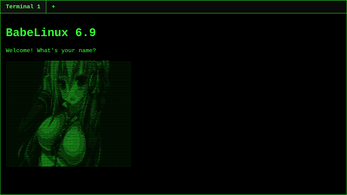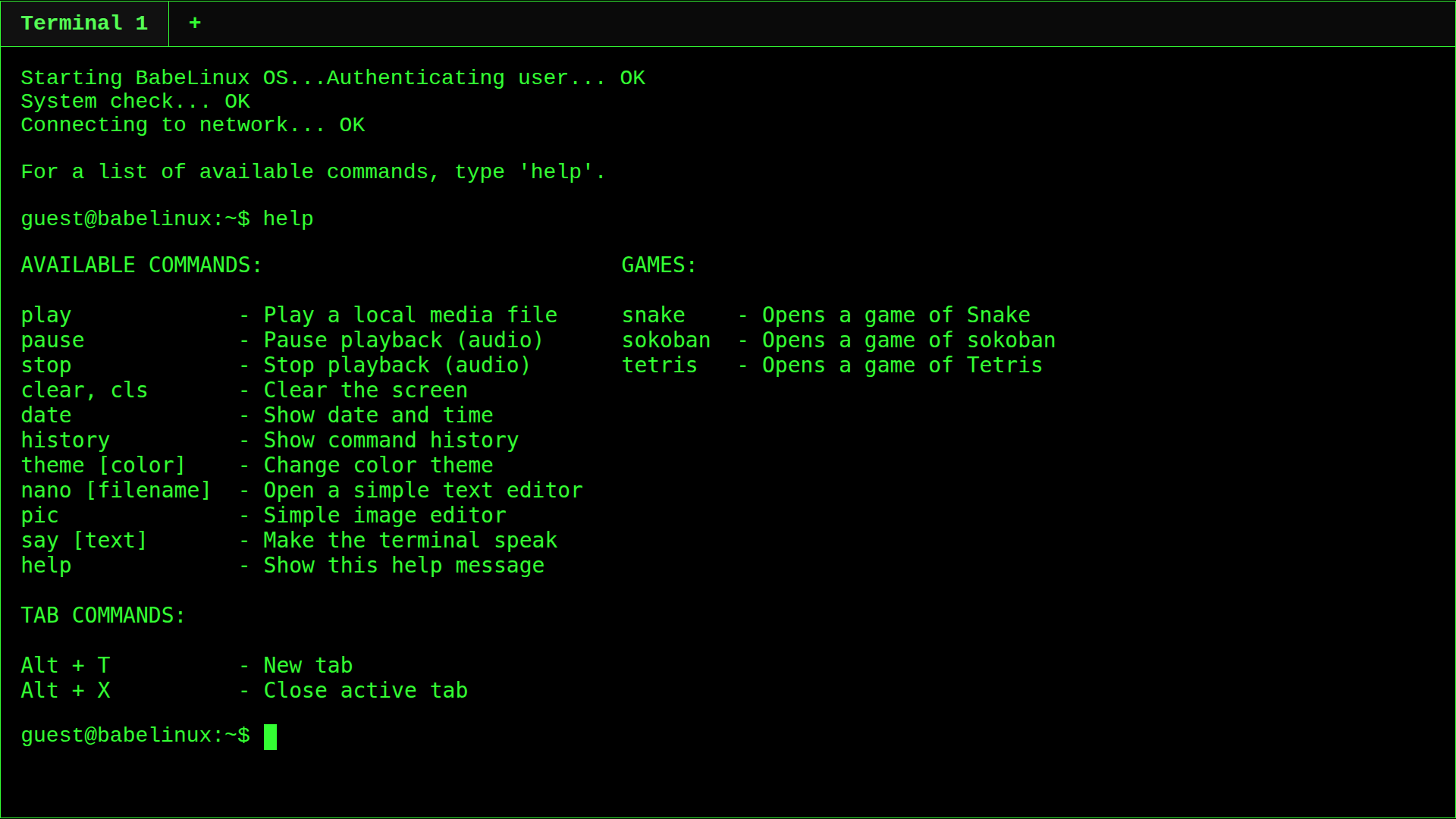 BabeLinux offers a multi-tabbed retro-style interface. Users can run commands like `clear`, `date`, `history`, change themes, or use a text editor (`nano`), image editor (`pic`), and media player. It also features text-to-speech (`say`), command auto-completion, and classic ASCII games like Snake, Tetris, and Sokoban.