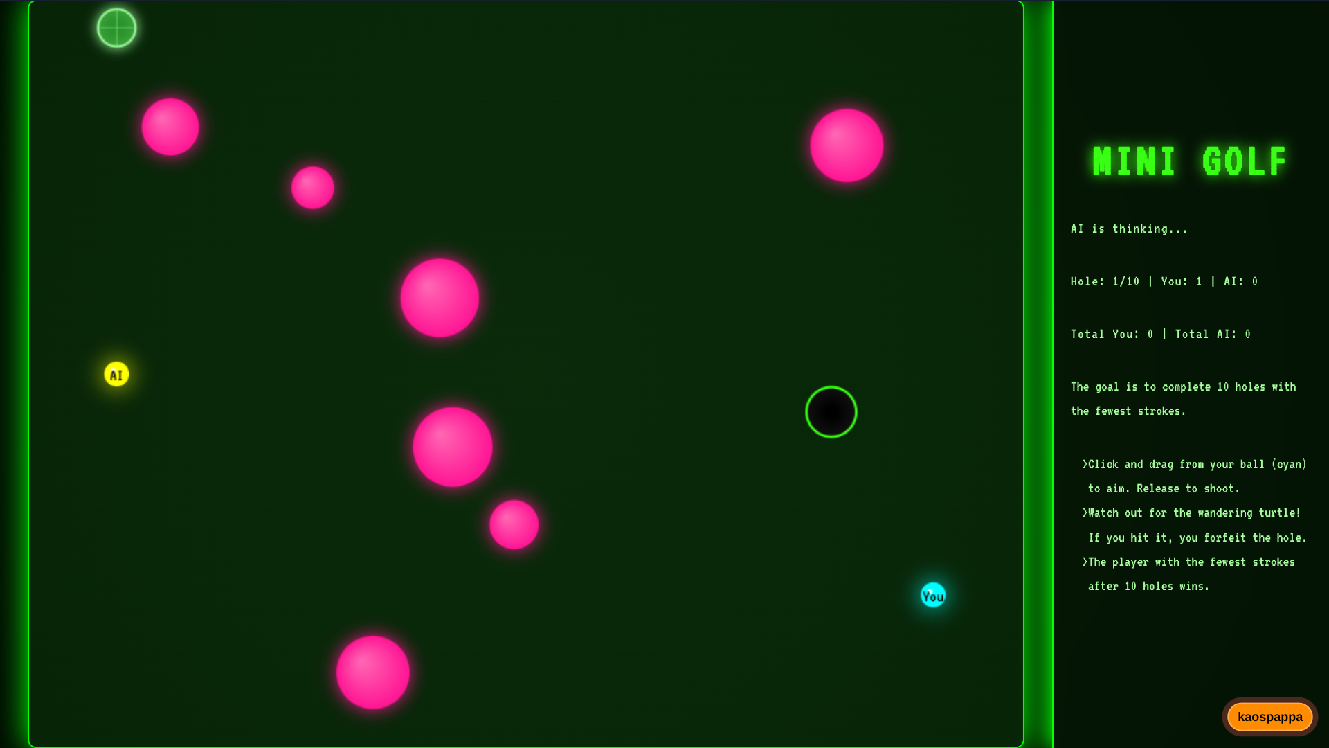 Mini Golf: Turtle Edition is a sophisticated, retro-inspired browser game that combines classic physics-based gameplay with a unique hazard mechanic. Developed with a vibrant "neon-terminal" aesthetic, the game challenges players to compete against an adaptive AI across ten procedurally generated courses featuring dynamic obstacles and realistic ball physics. The experience is defined by its strategic depth incorporating friction, restitution, and "hole gravity" while introducing a high-stakes wandering turtle hazard that imposes significant stroke penalties upon collision. With its responsive canvas-based rendering and integrated Web Audio API sound effects, the game offers a polished, competitive arcade experience directly in the browser.