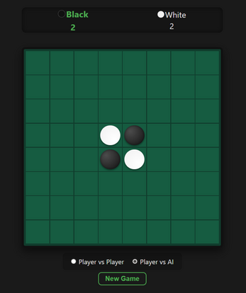 This sophisticated web-based application is a fully functional digital adaptation of the classic strategy board game Othello, featuring a sleek, dark-themed user interface built with HTML5, CSS3, and vanilla JavaScript. The game offers both local Player vs. Player and Player vs. AI modes, the latter of which utilizes a weighted-matrix heuristic engine to simulate intelligent decision-making based on positional advantages. Its responsive design incorporates smooth CSS transitions for piece animations, a dynamic status bar for real-time score tracking, and an integrated Web Audio API system that provides tactile sound effects for capturing and flipping tiles. Concluded with a clean, modern aesthetic and intuitive gameplay mechanics, the project represents a polished example of a browser-based strategy game.