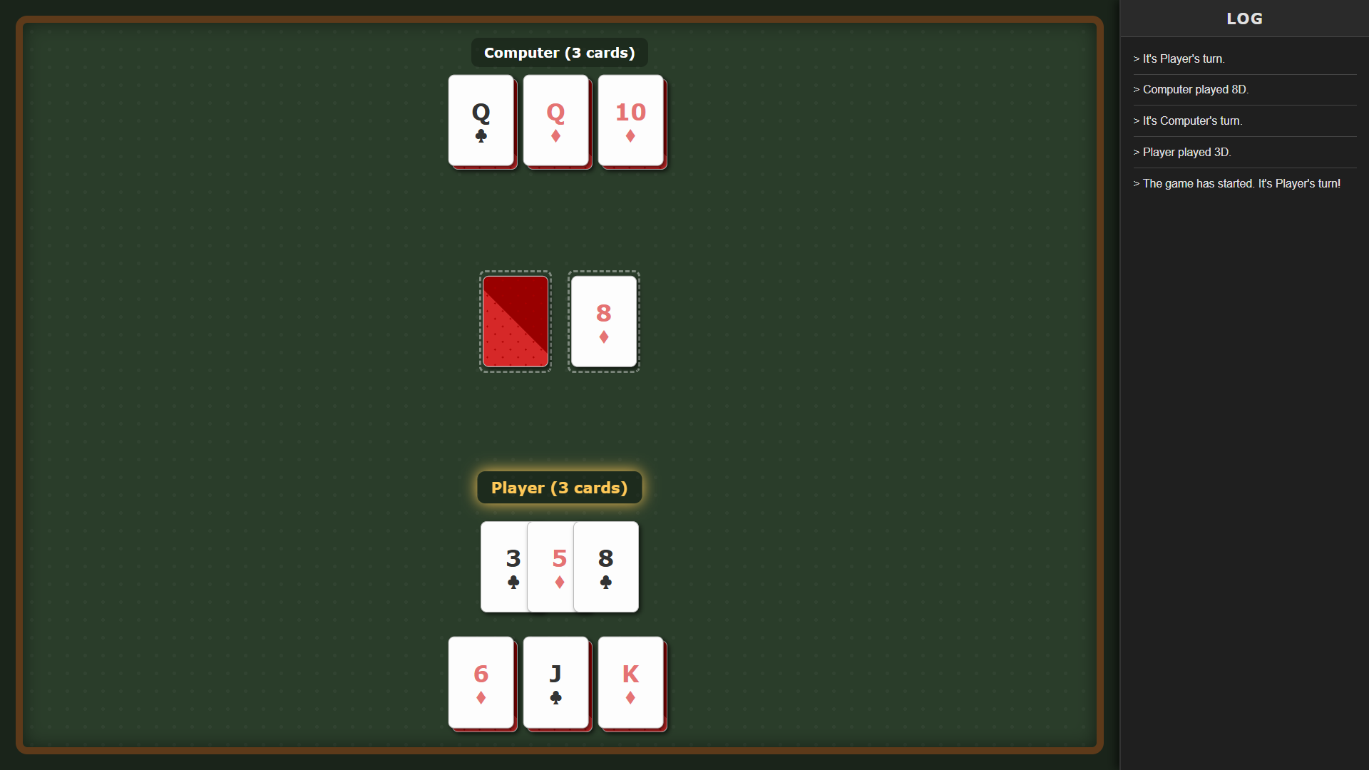 This single-page web application is a digital implementation of the classic shedding card game Shithead, featuring a refined interface and a strategic AI opponent. Developed with a focus on responsive design and intuitive gameplay, the application manages complex rule sets including special card abilities such as the reset function of the 2, the burn effect of the 10, while automating the multi-layered progression from hand to face-up and face-down table cards. The game provides a dynamic user experience through real-time log updates, visual turn indicators, and a structured "Goal" and "Rules" panel to guide players through the objective of avoiding being the last player with cards remaining.